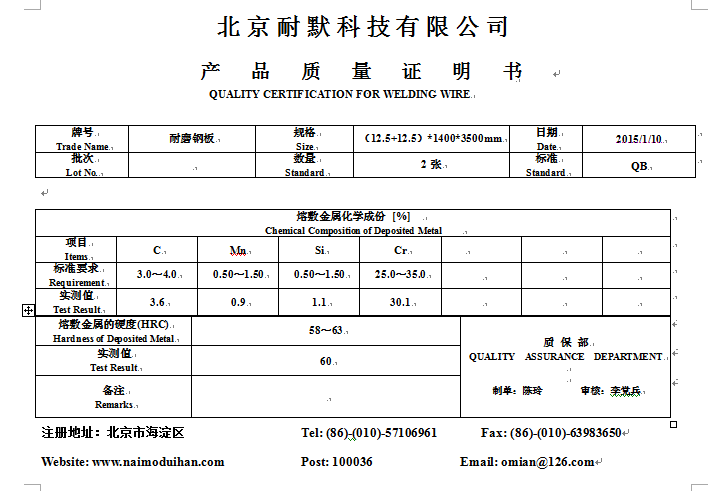 圖(2)北京耐默公司硬質合金堆焊焊絲產品質量證明書